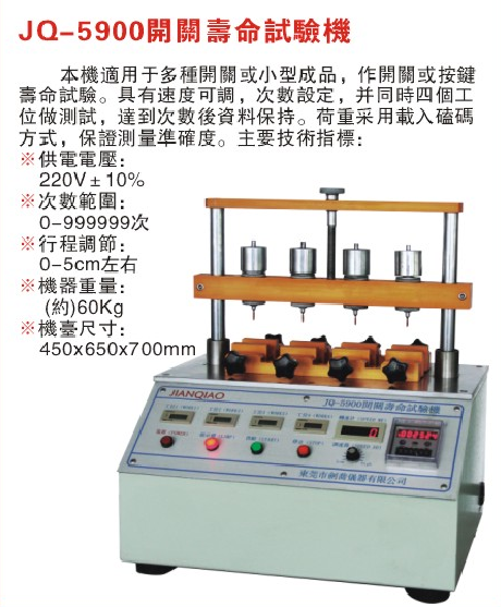 產(chǎn)品型號:JQ-5900 品牌:劍 喬 用途:一、產(chǎn)品介紹: 本機(jī)可對計(jì)算機(jī)、手機(jī)、記事本等到鍵盤作壽命測試。適用于多種開關(guān)或小型成品,作開關(guān)或按鍵壽命試驗(yàn),具有速度可調(diào)、次數(shù)設(shè)定,并達(dá)到次數(shù)后數(shù)據(jù)保持. 二、主