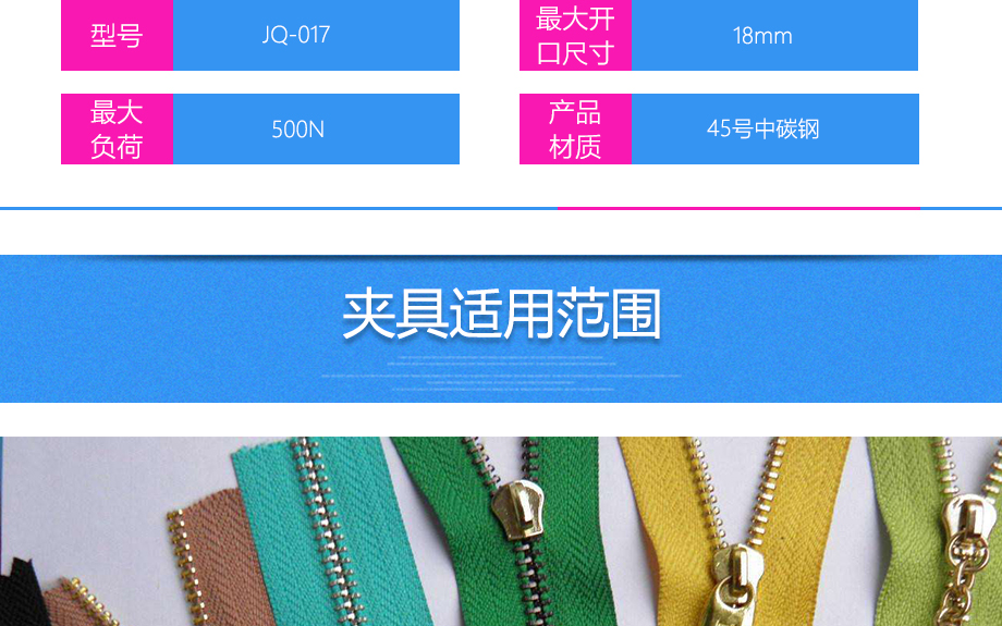 產(chǎn)品型號:JQ-017 品牌:劍 喬 用途:拉鏈夾具適用范圍:拉鏈材料的拉力,破壞力測試。