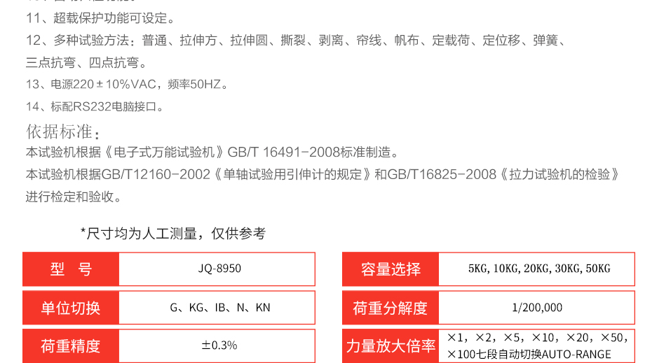 產(chǎn)品型號(hào):JQ-8950 品牌:劍 喬 用途:本系列機(jī)廣泛用于各類薄膜、五金、橡膠料、紡織、建材、絕緣體、電線、電纜、端子等各類材料。測(cè)試其拉伸、撕裂、穿刺、剝離、抗壓、彎曲、抗剪切、定荷重、定位移、三點(diǎn)抗折