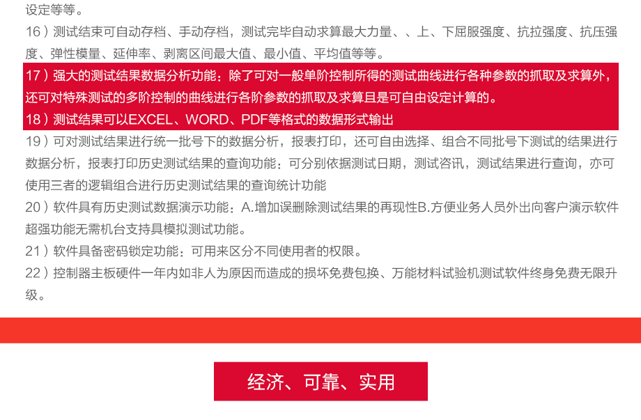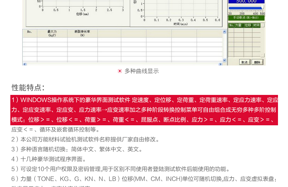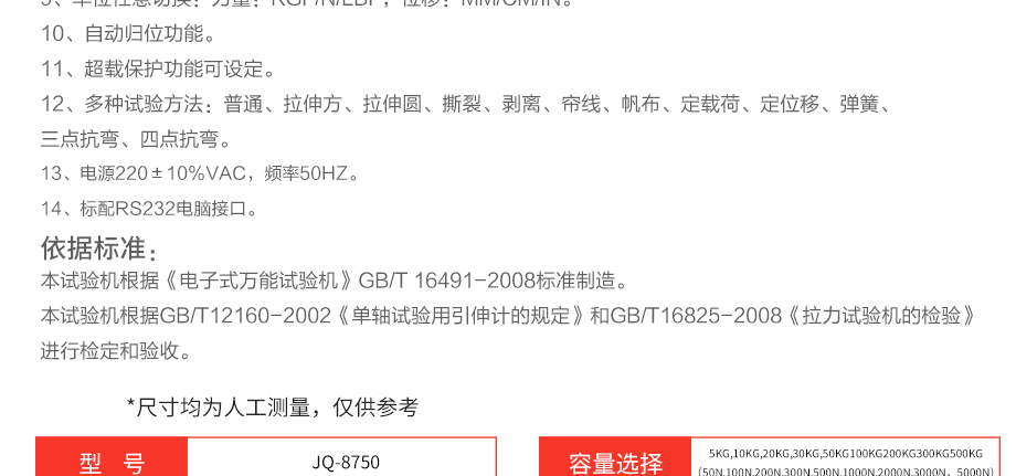 產(chǎn)品型號(hào):JQ-8750 品牌:劍 喬 用途:本系列機(jī)廣泛用于各類(lèi)五金、金屬、塑膠、橡膠料、紙品、包裝、鞋類(lèi)、皮革、服裝、紡織、建材、絕緣體、電線、電纜、端子等各類(lèi)材料。測(cè)試其拉伸、撕裂、剝離、抗壓、彎曲、抗剪切、定